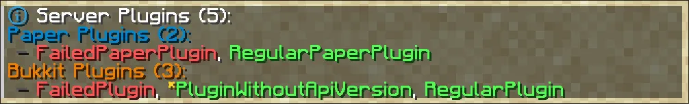The plugins command displays the list of all loaded plugins. Paper differentiates between two types of plugins: Paper plugins and Bukkit plugins. The difference is generally only relevant to plugin developers (guide to paper-plugin.yml). Plugins are marked as green if no issues occurred whilst enabling them and their functionality can be assumed working. Plugins marked red failed to load or were disabled. Check the startup logs for more information if that happens.